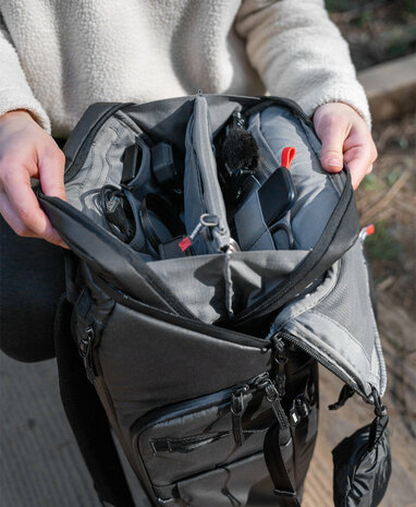 De binnenkant van de tas bevat meerdere gaasvakken met ritssluiting en elastische lussen voor stevig en veilig opbergen.